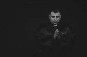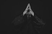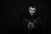 Zdjęcie "Piękne i fascynujące gry teatrze aktor na aparat. Czarno-białe zdjęcie aktora w przebraniu żebraka na ciemnym tle. Pięknie zdobione etapie obraz i profesjonalny makijaż." może być wykorzystywane do celów osobistych i komercyjnych zgodnie z warunkami zakupionej licencji Royalty-free. Obraz jest dostępny do pobrania w jakości wysokiej rozdzielczości do 5760x3840.
