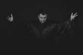 Piękne i fascynujące gry teatrze aktor na aparat. Czarno-białe zdjęcie aktora w przebraniu żebraka na ciemnym tle. Pięknie zdobione etapie obraz i profesjonalny makijaż.