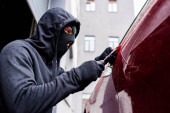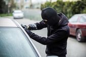 Samochodu złodziej próbuje włamać się do samochodu z śrubokręt.