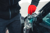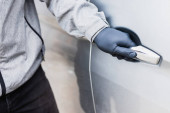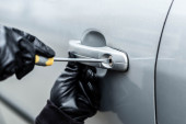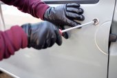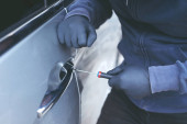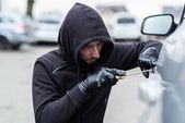 Samochodu złodziej próbuje włamać się do samochodu z śrubokręt.