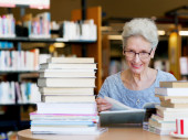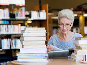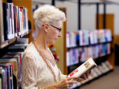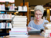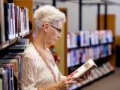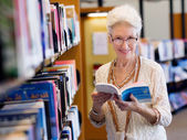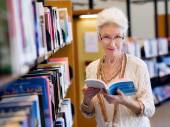 starszy kobieta czytanie i wybór książki w bibliotece