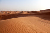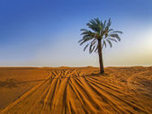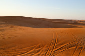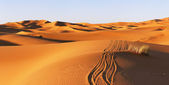 Sand dune krajobraz w arabskiej pustyni i śladowe ilości samochodów