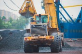Żółty Ciężki Koparka i spychacz kopania piasku i pracę podczas robót drogowych, rozładunku piasek i żwir podczas budowy nowej drogi