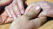Młody mężczyzna ręce pocieszające starsze pary rąk babci odkryty z bliska.