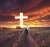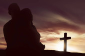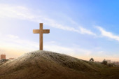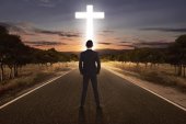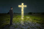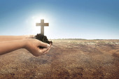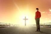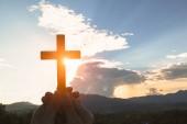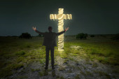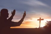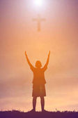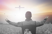 Portret mężczyzny, podnosząc rękę, modląc się do Boga z jasnym cr