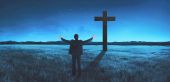 Zdjęcie "Portret mężczyzny, podnosząc rękę, modląc się do Boga z jasnym cr" może być wykorzystywane do celów osobistych i komercyjnych zgodnie z warunkami zakupionej licencji Royalty-free. Obraz jest dostępny do pobrania w jakości wysokiej rozdzielczości do 5760x3840.