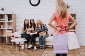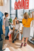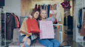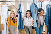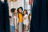 Grupa stylowych młodych kobiet biorąc selfie w sklepie odzieżowym