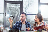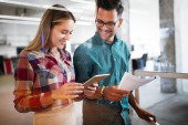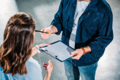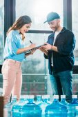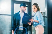 Dostawy mężczyzna i Kobieta, patrząc na zgłoszenia ładunku