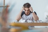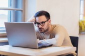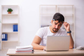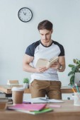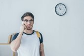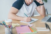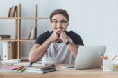 przystojny student mężczyzna w okularach pisania w rezerwowym