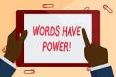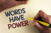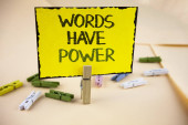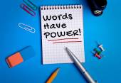 Uwaga: pisanie Wyświetlono słowa mają moc. Biznesowe zdjęcie prezentujący instrukcji, mówisz, że są w stanie zmienić rzeczywistości na papierze notatki na pióro drewniane tła obok niego.