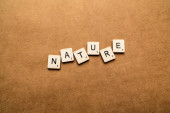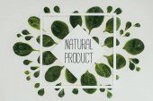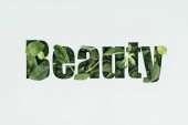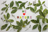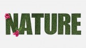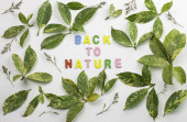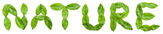 Natura słowo z świeżej zieleni liści na białym tle na szary