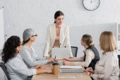 kobieta kobieta interesu, wskazując na flipchart kolegów o spotkania w biurze