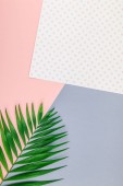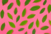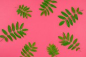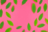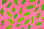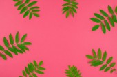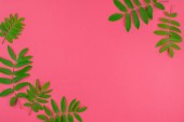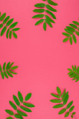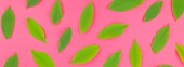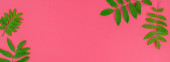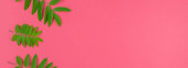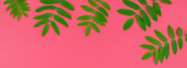 Kreatywnych mieszkanie świeckich widok z góry wzór zielony świeży pozostawia na jasny różowy tło w stylu minimal pop art. Długie szerokie transparent
