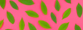 Zdjęcie "Kreatywnych mieszkanie świeckich widok z góry wzór zielony świeży pozostawia na jasny różowy tło w stylu minimal pop art. Długie szerokie transparent" może być wykorzystywane do celów osobistych i komercyjnych zgodnie z warunkami zakupionej licencji Royalty-free. Obraz jest dostępny do pobrania w jakości wysokiej rozdzielczości do 5760x3840.