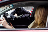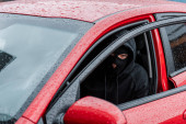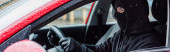 złodziej mężczyzna w czarnym kapturem z latarką, patrząc na samochód