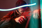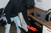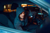 ostrożne rabuś mężczyzna w czarnym kapturem naruszania samochodu przez śrubokręt