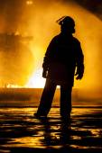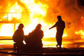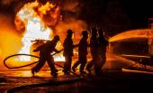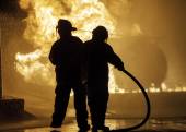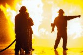 Johannesburg, RPA - maja, 2018 strażaków klęcząc przed burning struktury podczas walki treningu