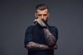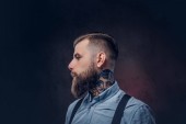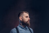 Profil przystojny staromodny w niebieską koszulę i szelki. Na białym tle na ciemnym tle.