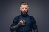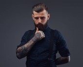 Zamyślony przystojny staromodny w koszuli i szelki, pozować z ręki na podbródek. Na białym tle na ciemnym tle.