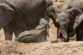Niepewny słoniątka próbować wspiąć się na bank
