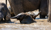 Słoniątka z jego rodziny przy wodopoju w sawanny Namibii