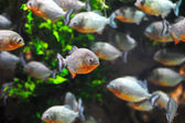 Stado mięsożernych ryb z rodziny Kharacin - Piranha wspólne w sztuczne akwarium słodkowodne
