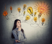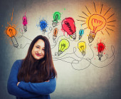Zdjęcie "Młoda kobieta w okularach i trzymając dwie książki stoją nad tablica tło z żarówki szkicu nad głową, usunięcie wyrafinowany równań matematycznych, obliczania i formuł." może być wykorzystywane do celów osobistych i komercyjnych zgodnie z warunkami zakupionej licencji Royalty-free. Obraz jest dostępny do pobrania w jakości wysokiej rozdzielczości do 5760x3840.