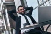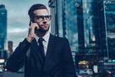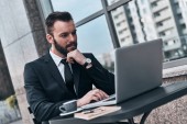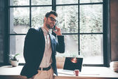 biznesmen rozmawia inteligentny telefon siedząc w kawiarni przy stole z kawą i laptopa