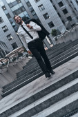 udane przystojny mężczyzna w kolorze rozmowy na telefon i przesunięcie w dół po schodach, przy ulicy