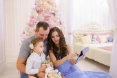 Zdjęcie "Uśmiecha się kobieta i mężczyzna siedzący z małą córeczkę utrzymanie obecnego, choinki w tle." może być wykorzystywane do celów osobistych i komercyjnych zgodnie z warunkami zakupionej licencji Royalty-free. Obraz jest dostępny do pobrania w jakości wysokiej rozdzielczości do 5760x3840.
