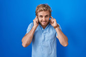 Niebieskooki, stylowy hipster ze smartfonem. Europejczyk baw się dobrze. Styl muzyczny.