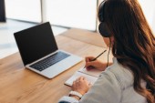 częściowy widok interesu w słuchawki wyposażone Notatnik, biorąc udział w seminarium w biurze