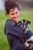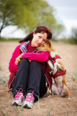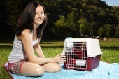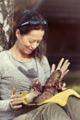 Fretka na smyczy, cieszyć się po południu w parku z hodowcą