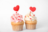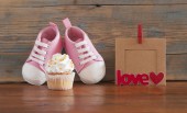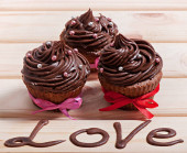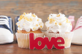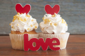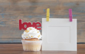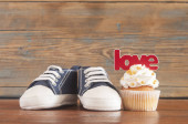 Tekst miłości i ciastko z serca kształty na podłoże drewniane
