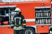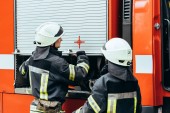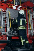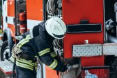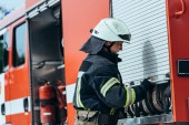 strażak mężczyzna w mundurze trzyma węża z wodą podczas kolega Sprawdzanie sprzętu w ciężarówce na ulicy