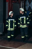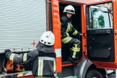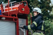 kobiece strażakiem z gaśnicy na tył stojącego na wóz strażacki na ulicy