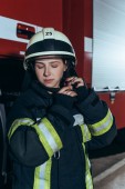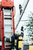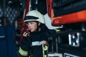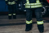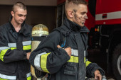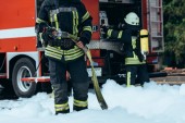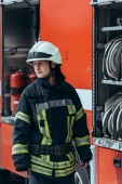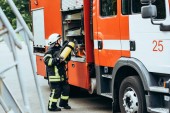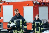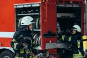 portret strażaków w ognioodporne jednolite stojąc na ulicy z wóz strażacki za