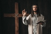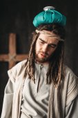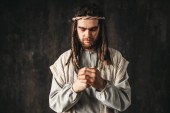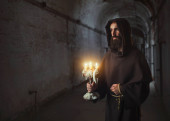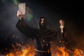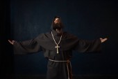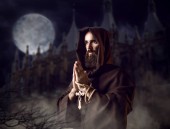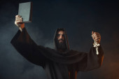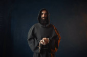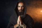 Średniowieczny mnich w czarny płaszcz z kapturem modląc się z zamkniętymi oczami, tajny rytuał. Tajemnicze fr. w ciemno zielonego. Tajemnica i duchowość