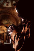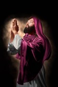 Średniowieczny mnich w czarny płaszcz z kapturem modląc się przed zamek i pełni księżyca w noc, tajny rytuał. Tajemnicze fr. w ciemno zielonego. Tajemnica i duchowość