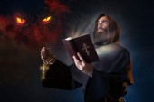 Zdjęcie "Średniowieczny mnich w czarny płaszcz z kapturem modląc się przed zamek i pełni księżyca w noc, tajny rytuał. Tajemnicze fr. w ciemno zielonego. Tajemnica i duchowość" może być wykorzystywane do celów osobistych i komercyjnych zgodnie z warunkami zakupionej licencji Royalty-free. Obraz jest dostępny do pobrania w jakości wysokiej rozdzielczości do 5760x3840.