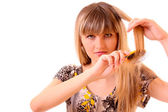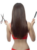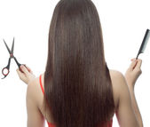 piękna kobieta z długimi włosami i narzędzia fryzjerskie, na białym tle