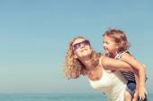 uśmiechający się nowoczesnych matka i dziecko w strój kąpielowy na plaży, zabawy czas. chronić włosy od słońca, ciepła i wilgotności przed wyruszeniem na plażę. minimalnej do nie pokoju tłum. blond włosy dziecka.