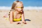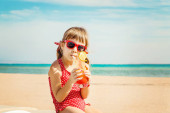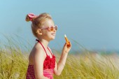 modny dziewczyna w czerwony strój kąpielowy zastosowaniu pomadki z spf, na wybrzeżu Oceanu. chronić włosy od słońca, ciepła i wilgotności przed wyruszeniem na plażę. Dzika plaża z zieloną trawę i nie ma ludzi.