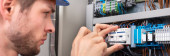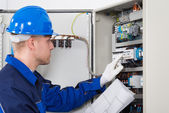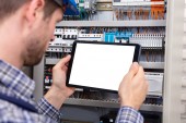 Technika, trzymając cyfrowego tabletu z pustego ekranu przed Skrzynka bezpieczników
