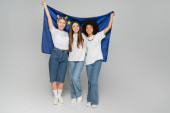 pewny siebie dziewczyna ubrana Przylądek czerwony superbohatera w pobliżu atrakcyjnych kobiet na szarym tle