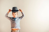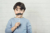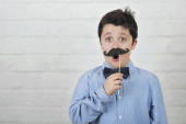 Zabawne dziecko z gestykulacji fałszywe wąsy jak dorosły człowiek, dojrzałości i koncepcja biznesowa.