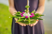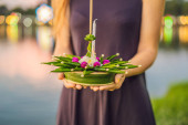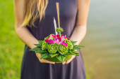 Zdjęcie "Młoda kobieta świętuje Loy Krathong, działa na wodzie. Loy Krathong festival, ludzie kupują kwiaty i świece światło i unosić się na wodzie z okazji festiwalu Loy Krathong w Tajlandii Banner, długo" może być wykorzystywane do celów osobistych i komercyjnych zgodnie z warunkami zakupionej licencji Royalty-free. Obraz jest dostępny do pobrania w jakości wysokiej rozdzielczości do 5760x3840.