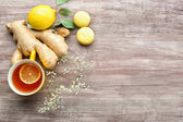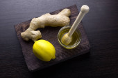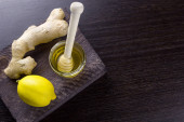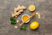 Widok z góry cytryna, imbir, mięta i płynnego miodu słoik z drewnianą łyżką na różowy tło wibrujący