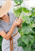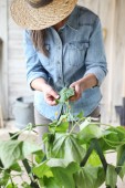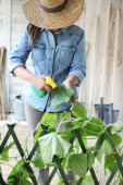 Kobieta w ogród warzywny spraye pestycydów na liść roślina z