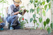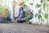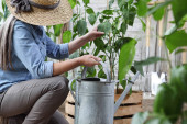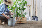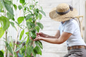 Zdjęcie "Kobieta w ogród warzywny spraye pestycydów na liść roślina z" może być wykorzystywane do celów osobistych i komercyjnych zgodnie z warunkami zakupionej licencji Royalty-free. Obraz jest dostępny do pobrania w jakości wysokiej rozdzielczości do 5760x3840.